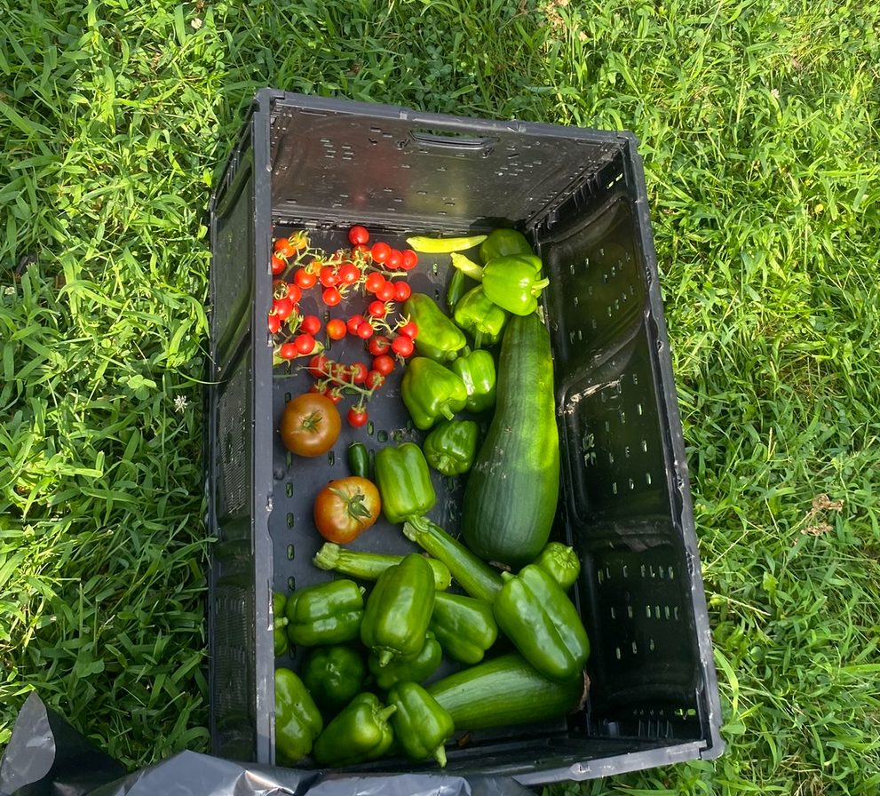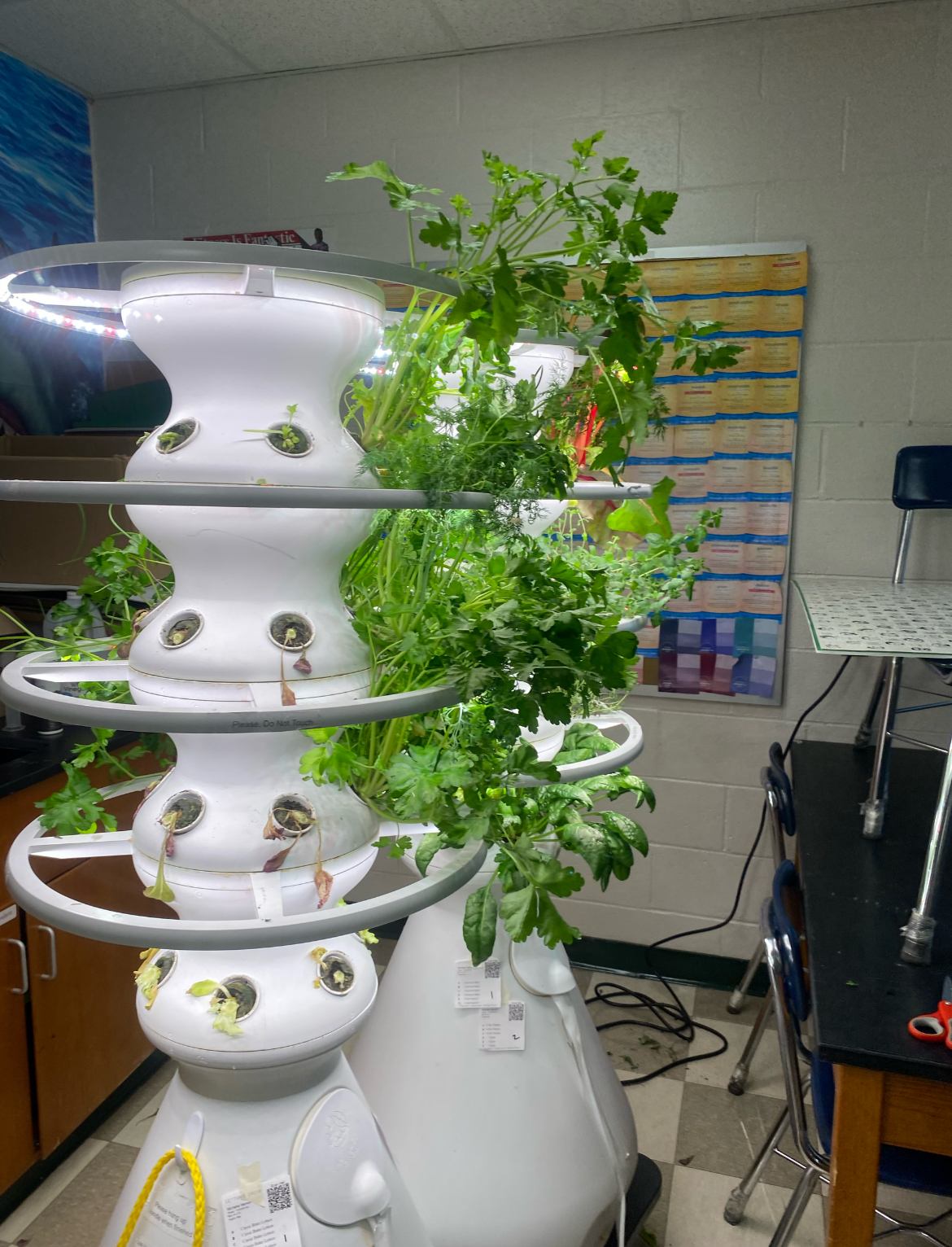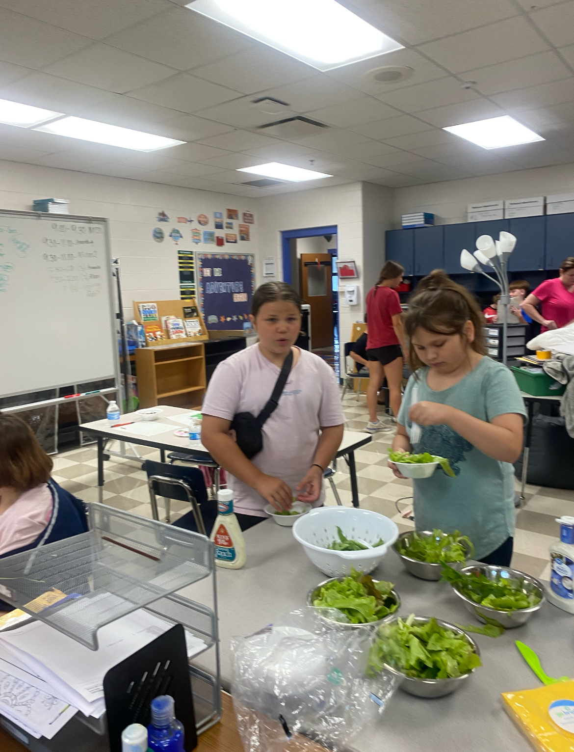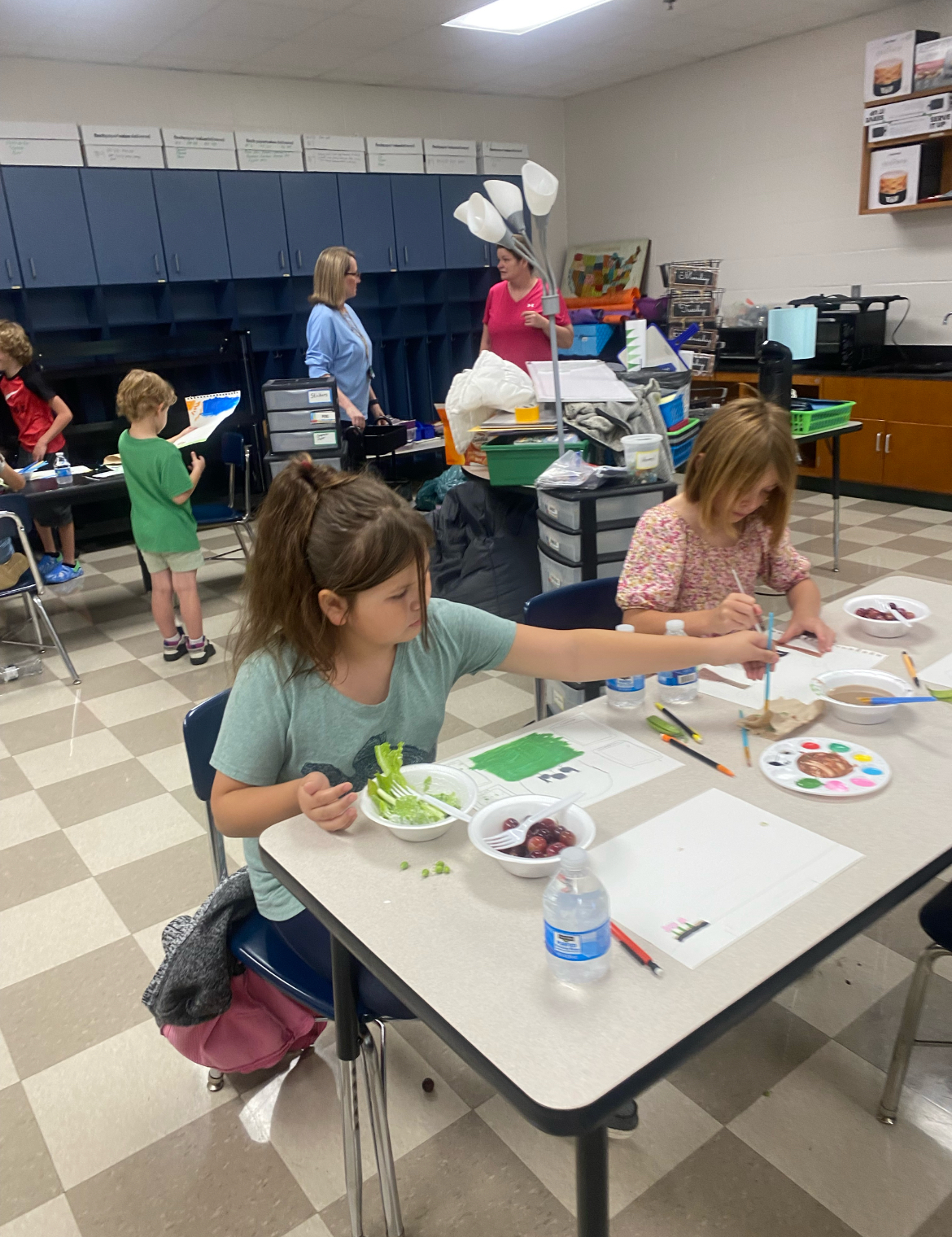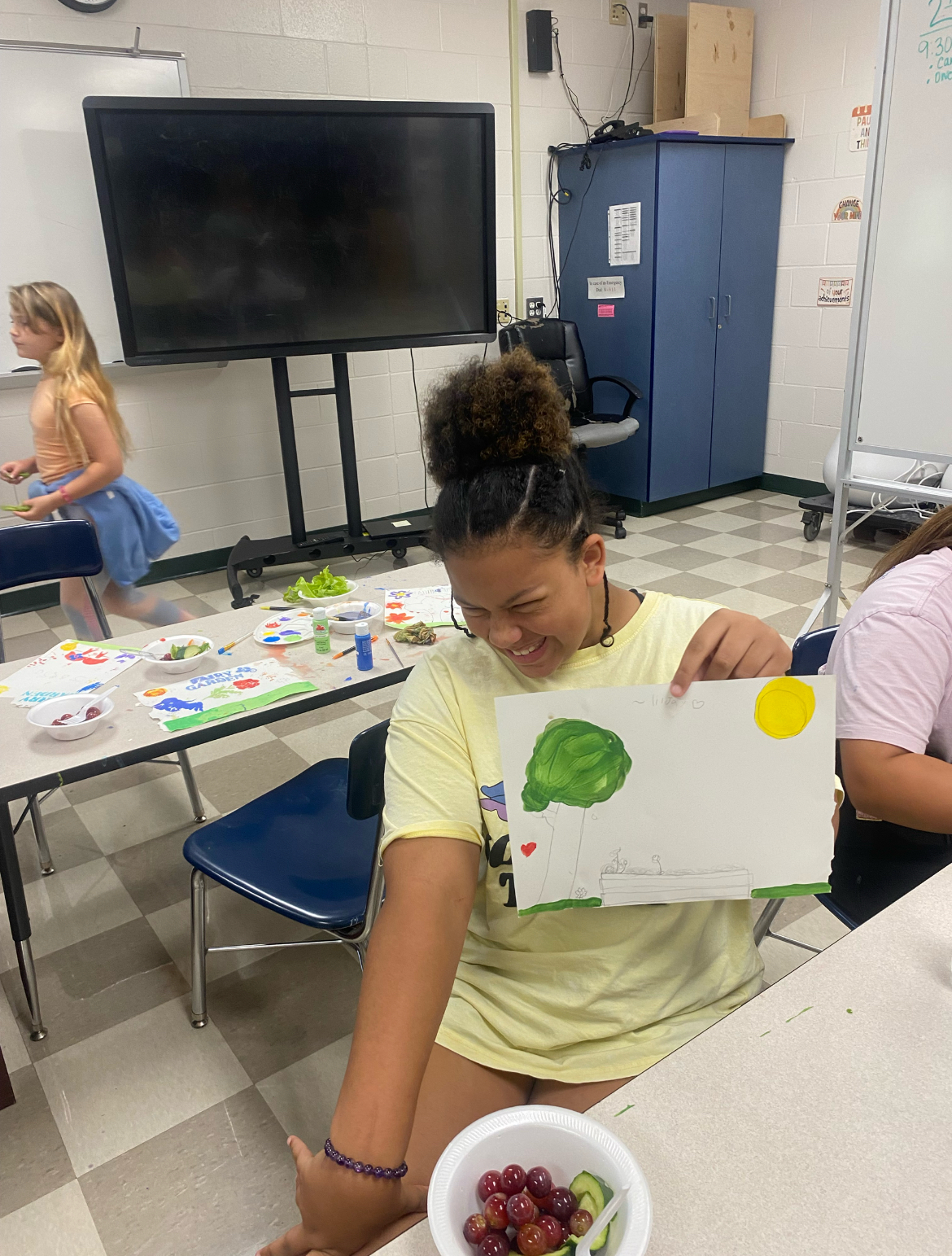health disparities through education and access to nutritious foods, especially in underserved communities. Through the USDA Farm to School Planning Grant received in 2023, HUGS has built 2 courtyard gardens at the New Miami School District and participated in both traditional and hydroponic gardening with the students. 16 hydroponic towers were also placed in 8 other local schools. Hydroponic towers involve growing produce using nutrient rich water rather than soil. This summer, HUGS has participated in Garden Club with students at New Miami elementary school. Students have gotten to help with the gardening, complete garden-related projects, and do taste testing using fresh fruits and vegetables from the garden. Here are a few photos from New Miami’s gardening this summer! They show students painting their “dream garden” and doing a salad taste testing as well as a recent harvest from their gardens.